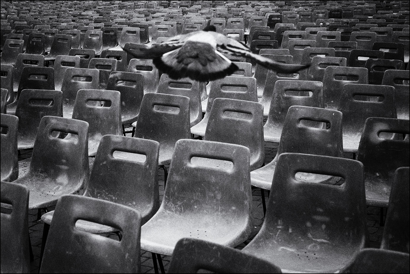 Über einer grauhaarigen Ebene von Stühlen flattert ein Sturmvogel stolz, ähnlich wie graue Tauben.